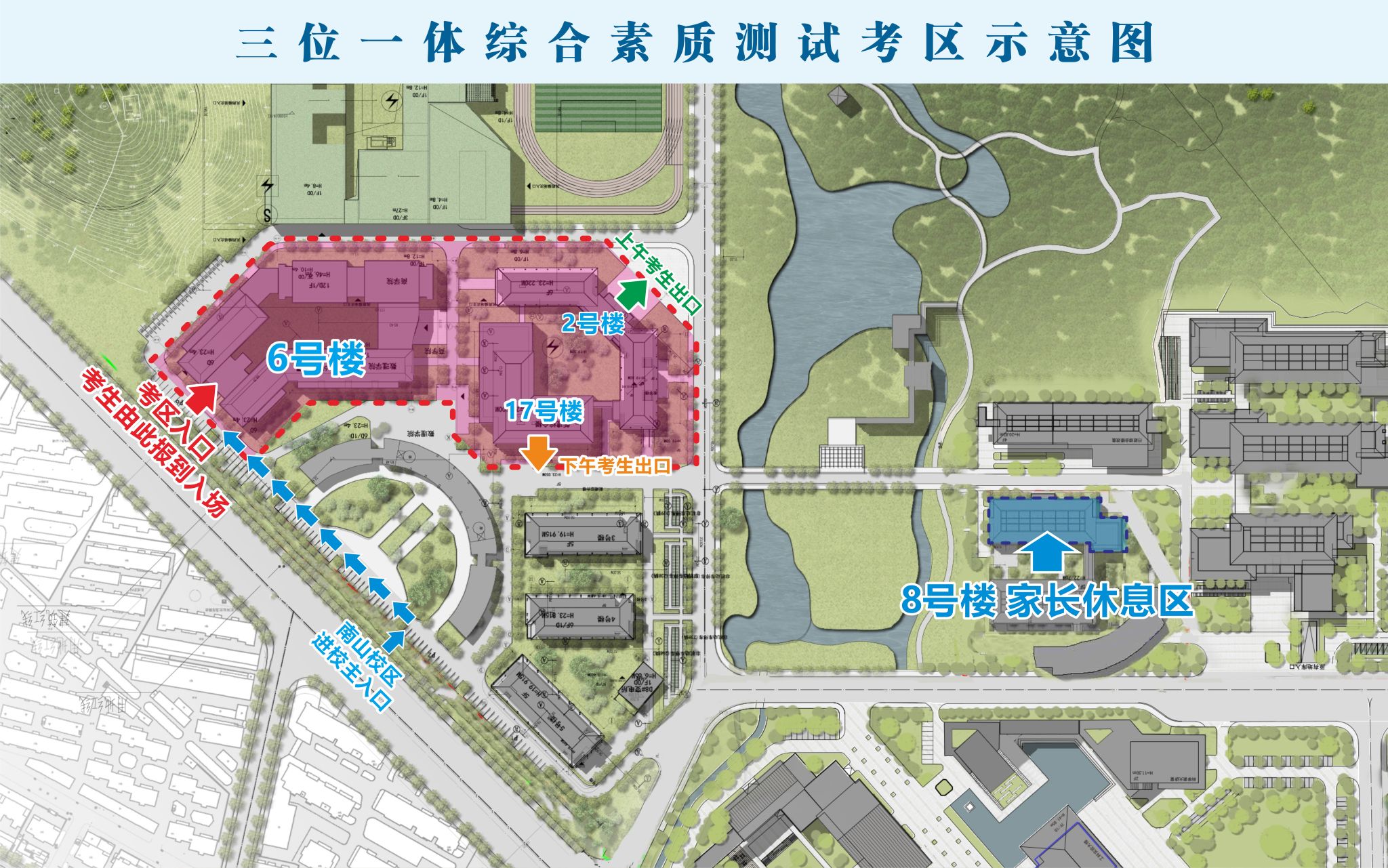 2.学校在南山校区8号楼设立考生家长休息区,进出校园请服从工作人员指挥,车辆有序停放。